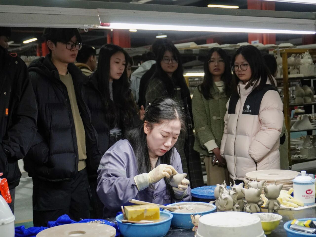 走進(jìn)生產(chǎn)區(qū),學(xué)生們目睹了陶瓷從原料成型到燒制出窯的全過程。在拉坯師傅的巧手下,器物線條愈發(fā)流暢;后又見證了操作員調(diào)色、施釉,在精細(xì)的操作中,坯體煥發(fā)出別樣光彩;以及于素胚之上巧運(yùn)靈思、妙筆生花的畫坯等工序后,企業(yè)技術(shù)人員還介紹了現(xiàn)代化生產(chǎn)設(shè)備如何與傳統(tǒng)工藝結(jié)合,提升生產(chǎn)效率與產(chǎn)品品質(zhì)。